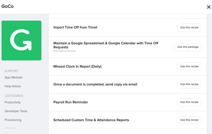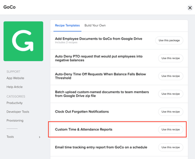 This guide explains how to install, configure, and run the GoCo Custom Time & Attendance Report recipe template from the Marketplace. It covers on-demand and scheduled versions, available report types, configurable columns, grouping options, and key time tracking settings.