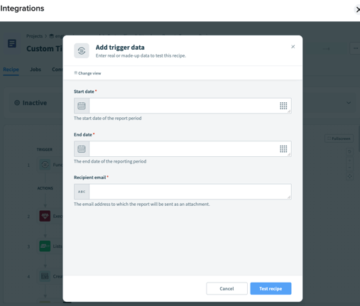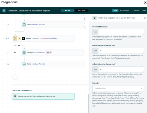 - Click "Test recipe" to generate and receive the report by email (sent by Workato Notification).